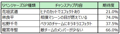 キャラごとに映像にチャンスアップがあり添付の表のとおりとなっています。