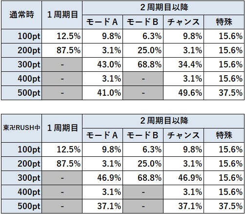 通常時、東卍RUSH中ともに2周期目以降の200pt、400ptで周期到達した場合はモードBや特殊の可能性がぐっと上がるので要注目です!