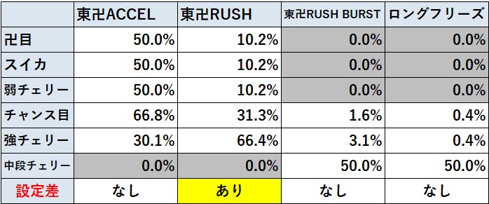 モードは規定ポイントと規定周期にはもちろん影響がありますが、ATが当たるかどうかは天井ボーナス回数だけではなく、初当り獲得時のモードによって抽選で毎回決定しています。よって当たったタイミングでボーナス回数に関係なく、モードを参照して「東卍RUSH」or「東卍CHANCE」のどちらかに当選します。ただし、東卍CHANCEが最大4連続した後はモードに関係なく「東卍RUSH」に当選します。